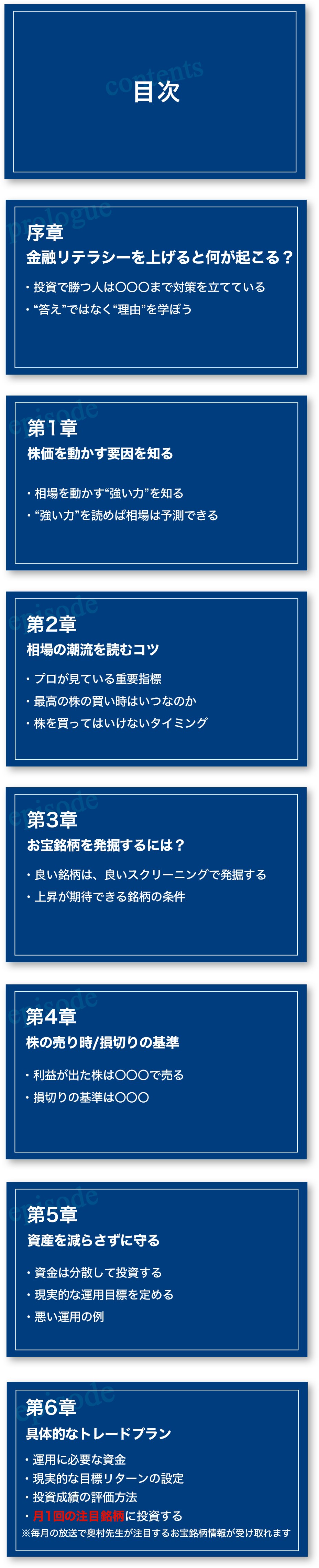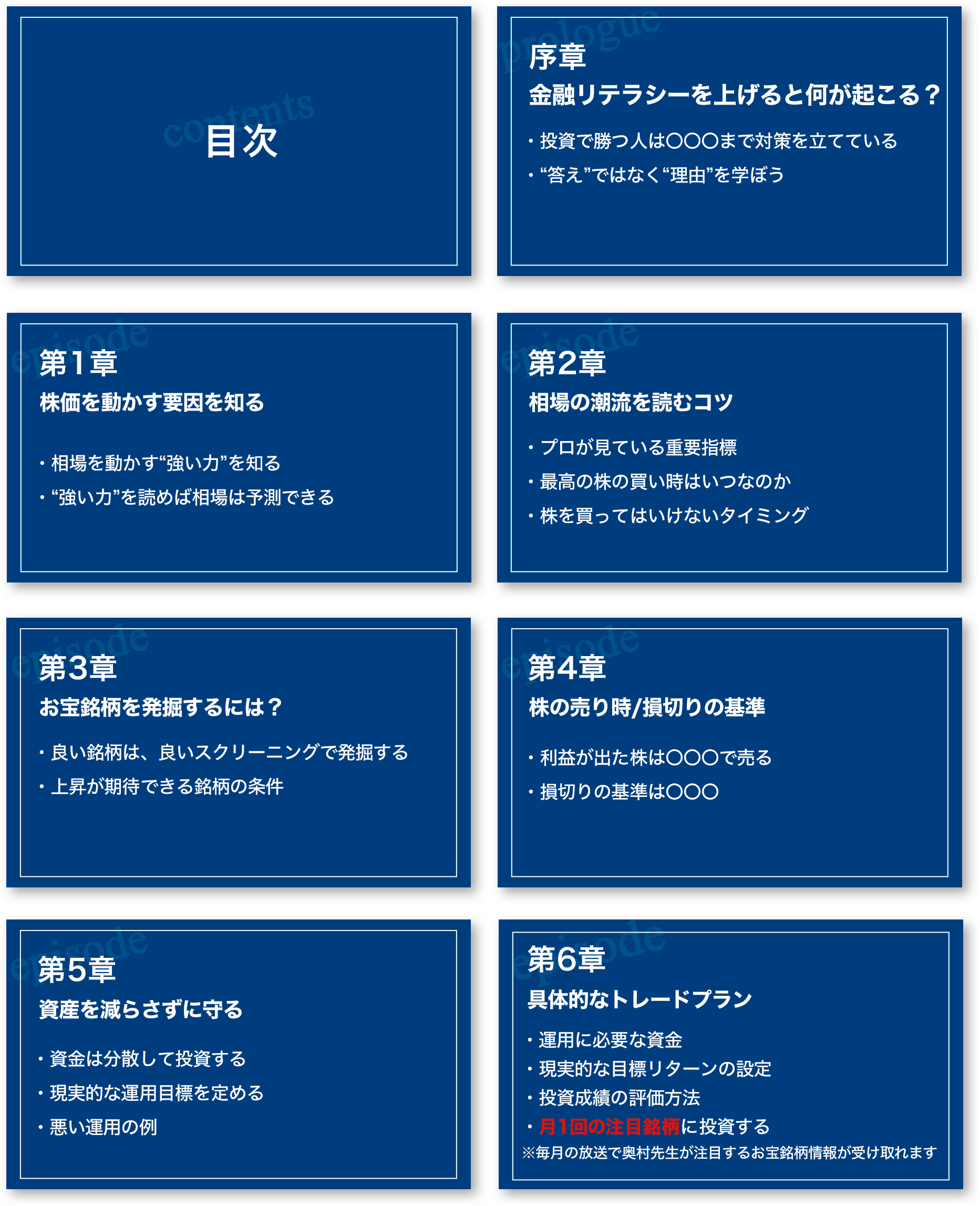 金融リテラシーって何?なんとなく自分に足りていない気がする… 投資にまつわる情報を精査できずいつも不安... 周囲に信頼できる一流の投資家がいない 投資について勉強したいけど何からはじめたら良いかわからない 投資家として一生役立つ知識がほしい 本当に価値あるものと出会いたいと思っている 奥村先生の銘柄情報がもらえないかとちょっとだけ下心がある