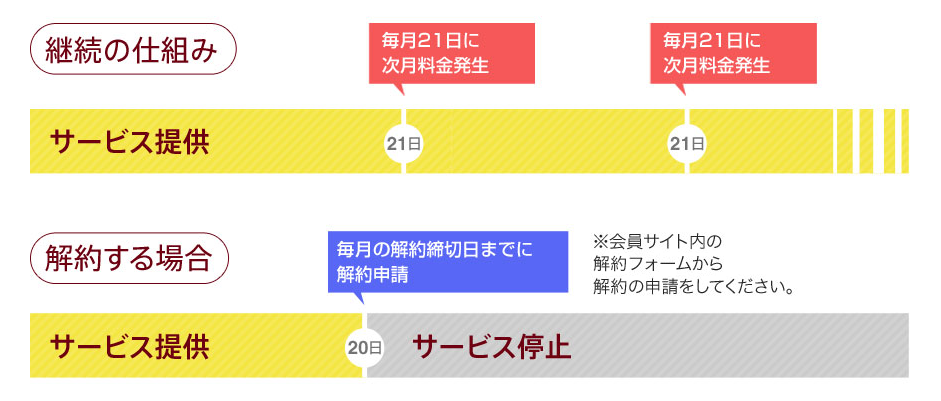 はい、専用の会員サイトに記載されている解約フォームからいつでも解約できます。 解約の申請は毎月20日までにお願いいたします。