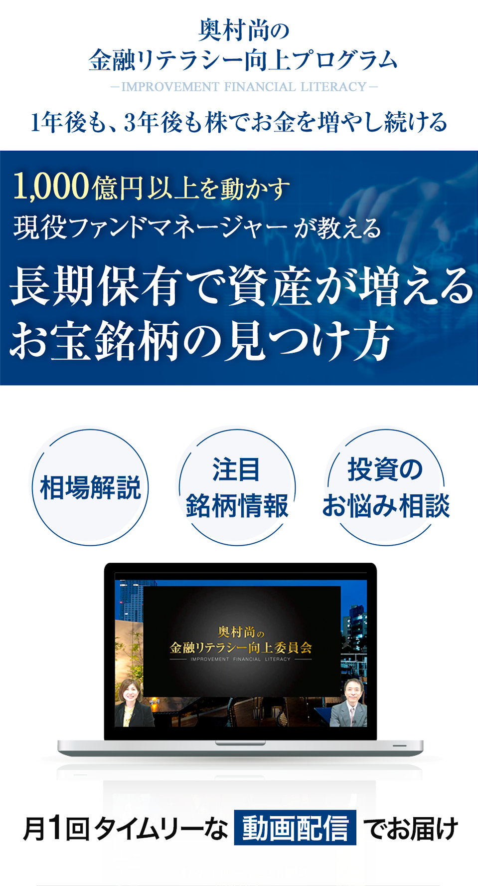毎回の配信を楽しみにしています。 奥村先生の的確なデータに基づいた数値や考察は、フィーリングで生きている私にはとてもありがたいもので、先を見越した投資の参考にさせていただいています。ありがとうございます。